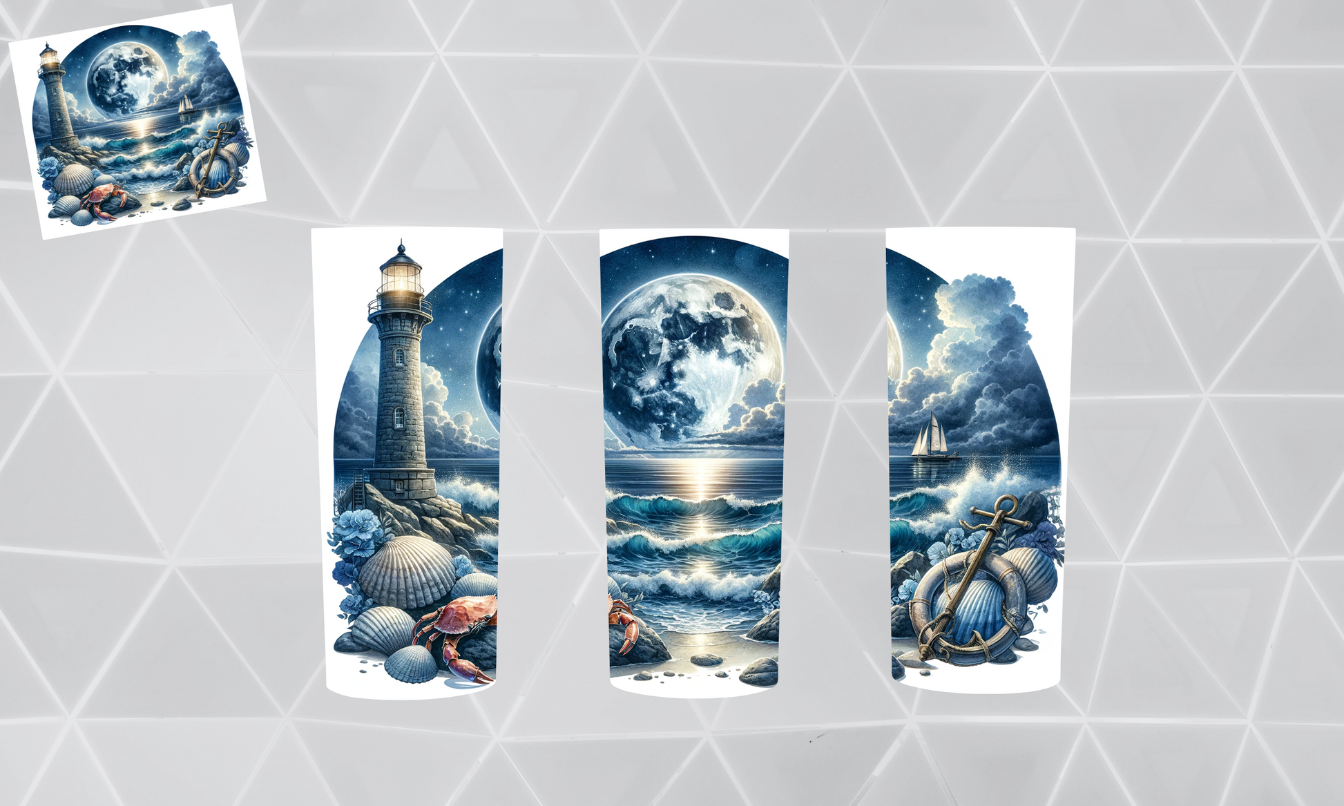 Genieße deinen Kaffee mit dem Leuchtturm 4 - der perfekte Begleiter für alle Meeresliebhaber! Mit dem Tumbler behältst du deinen Kaffee immer warm, während du den Anker und die Wellen betrachtest. Auch in der Nacht sorgt der Mond für eine romantische Stimmung (Kaffee nicht inbegriffen).